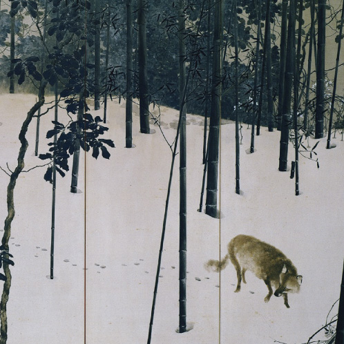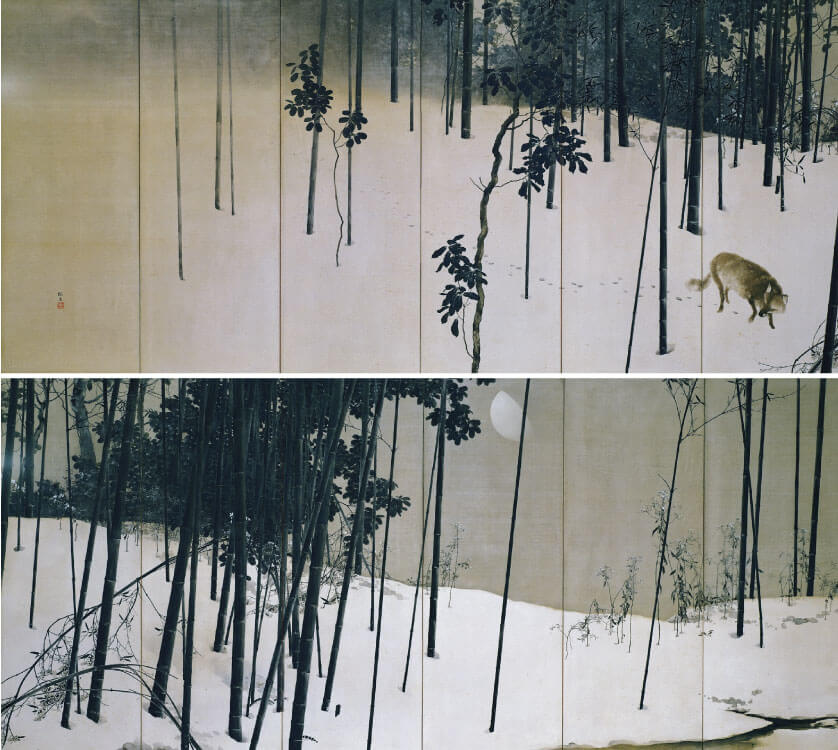 菊池芳文《春の夕・霜の朝》1903年 上:左隻 下:右隻 「桜の芳文」と称された菊池芳文の代表作《春の夕・霜の朝》をはじめとした春爛漫の光景は岡崎公園の疏水に桜吹雪が舞う頃に。また、縁側で月を待つ後ろ姿の美人画《待月》をはじめとした「上村松園の芸術」は蒸し暑い祇園祭の頃に。重要文化財に指定されている竹内栖鳳の《絵になる最初》をはじめとした「竹内栖鳳の芸術」は美しい嵐山の紅葉の季節に。そして、木島桜谷《寒月》をはじめとした雪のなかの動物たちは北山に時雨が降る頃に展示します。当館のコレクションルームでは、いつ京都を訪れれば、見たい作品や再会したい名品に逢うことができるのかわかるよう、年間展示計画を事前に発表します。《春の夕・霜の朝》の桜の花に隠れる雀たち、《絵になる最初》で恥ずかしそうに視線を外す娘、《待月》の着物美人が持つ帯のうさぎ、《寒月》の照る雪の竹藪を忍び足で歩く狐が、鑑賞者に会えるのを待っています。いつ訪れても、京都らしい季節を感じることのできる新名所として、京都の美の世界をお楽しみください。