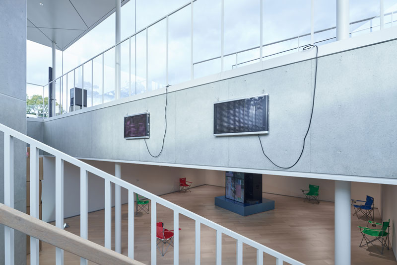 まつわる作業集団ARCHIVES PAY(アーカイブスペイ)や音楽グループNEW MANUKE(ニューマヌケ)のメンバーとしても活動。「音を作ることは、音を聞くことから始まる」と荒木が言うように、一貫して、音を作る行為そのものよりも、聞く環境の創造性に重きが置かれています。本展においても「聞く場を作る」ことを主軸に、当館の建築的特徴を生かした、音の再生装置としての空間が創出されます。録音された音そのものの響き、音が再生されるギャラリー内で発生する残響、鑑賞者の身体的移動による音の変化は、共鳴と反響の無数のレイヤーを生み出し、実体を持たない音の存在が立ち現れます。「ザ・トライアングル」について
