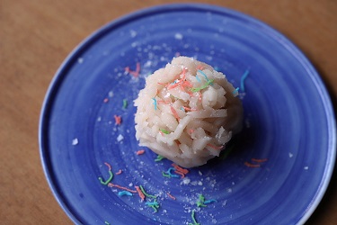 白いきんとんにカラフルなあんこを使ったトッピング。中には粒あんと金柑の甘露煮を入れました。