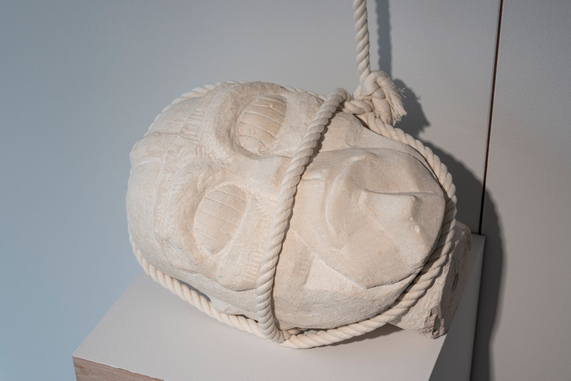 展示風景《First Lovers》 撮影:岡はるか 2023 米村優人は主に彫刻を用いたインスタレーション作品を制作する作家です。神話上の神々や昭和のヒーローなど「超人」たちへの憧れや畏怖を持ちながらも、その人体彫刻は手、足、頭部などがバラバラに展示されます。古典的な彫刻が本来持っている荘厳さや完全性は台なしとなり、崇高の念を雲散霧消させるように再構成する手法は作家の大きな特徴と言えます。