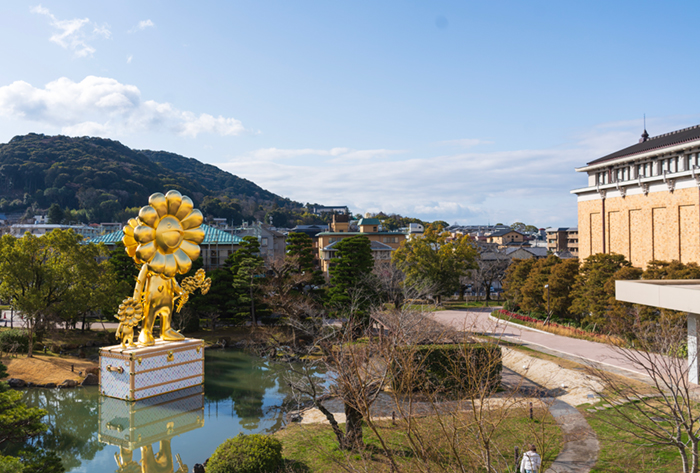 Photo: Reiko Mitake ©2020 Takashi Murakami / Kaikai Kiki Co., Ltd. All Rights Reserved.2020年コロナ禍の東京で公開され、復活への祈りの象徴として話題となった⾦⾊に輝く巨⼤な彫刻作品《お花の親⼦》。村上隆のスーパーフラットコンセプトの彫刻的実践の結実である本作が、ルイ・ヴィトンのトランクとともに京都市京セラ美術館の⽇本庭園に登場しました。