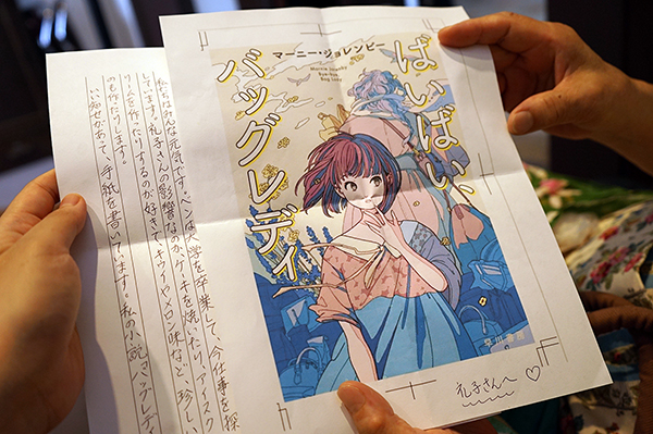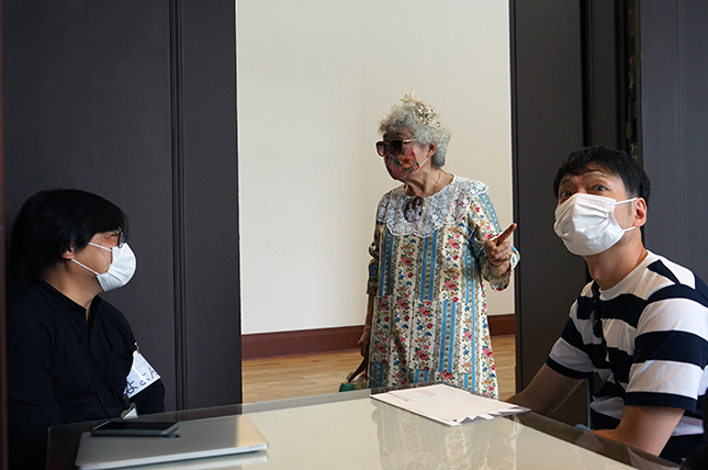 次室で寛いでいたお人形のような風貌の方に声をかけてみたところ、当館に思い出がたくさん詰まっていることや、アートを通じて国内外のさまざまな人と出会い、人生が豊かで愛に溢れていることを聞かせてくれました。カバンの中から手紙を出して見せてくれたり、旦那さんが買ってくれるかき餅の美味しさについて語ったり、身につけているアクセサリーはほとんど自分で作っていることを教えてくださいました。美術館を長年愛してくださる来館者の皆さんたちとじっくり話したり、世代を超えて質問しあったりするのも「ぽよよんタイム」ならではの魅力になっていく兆しを感じました。
