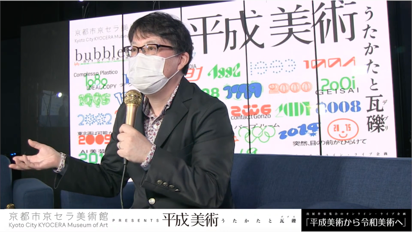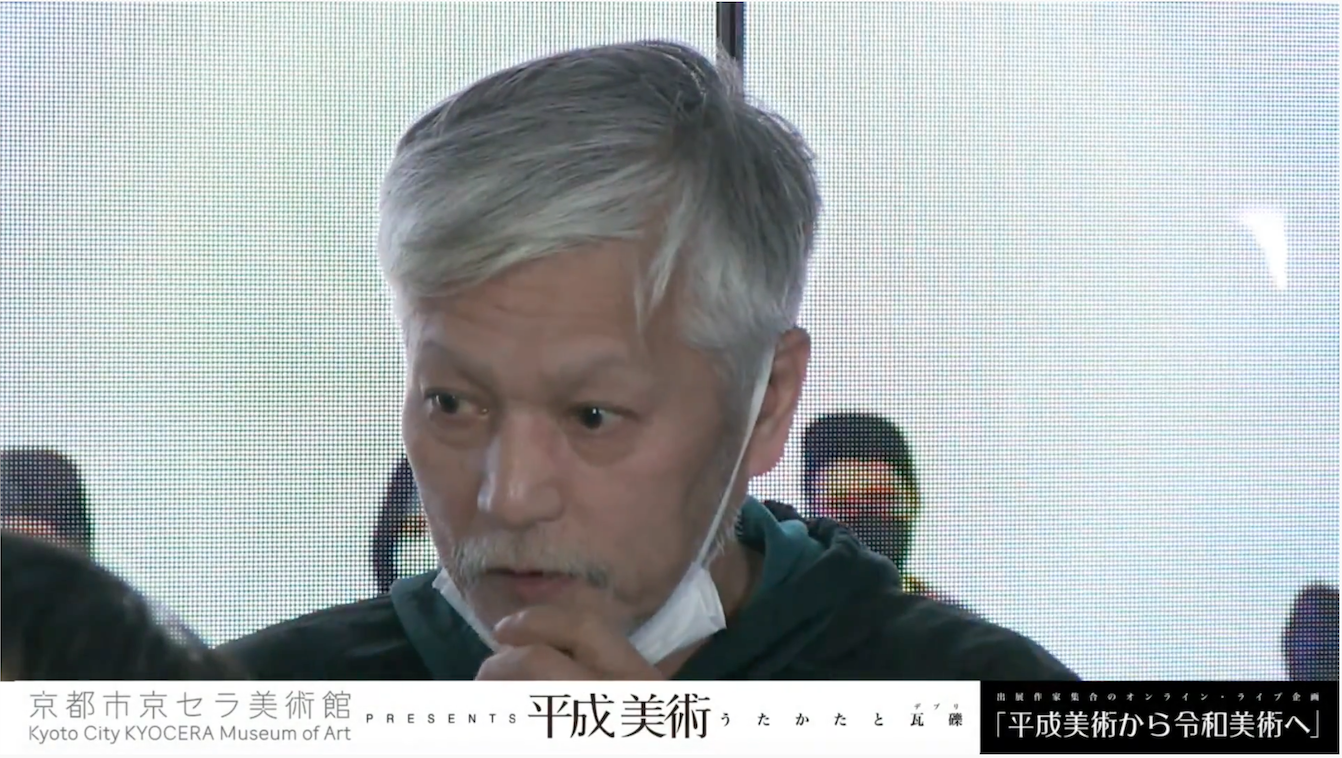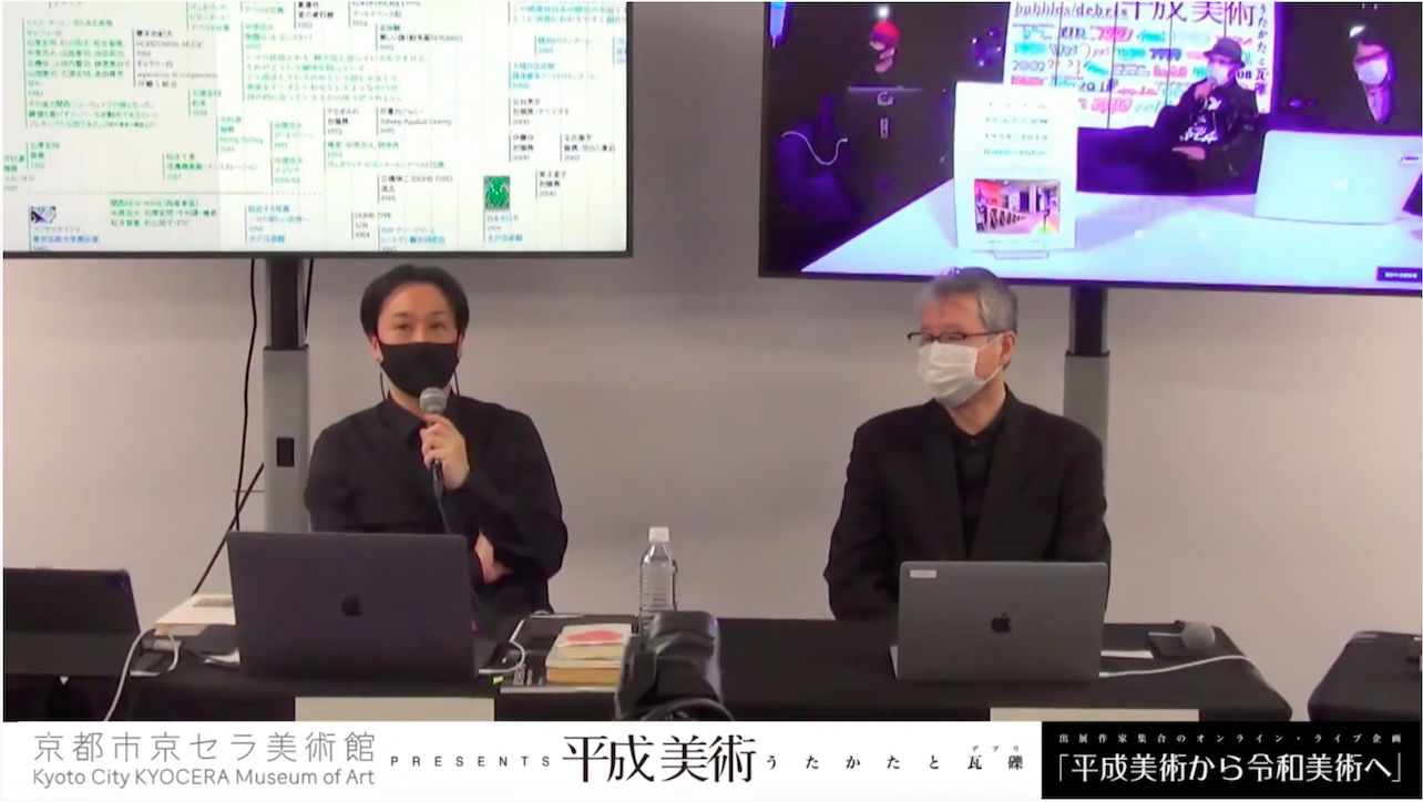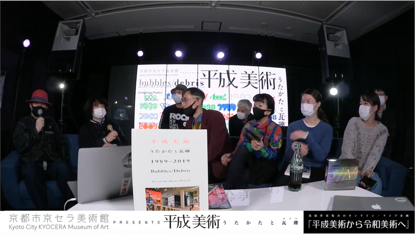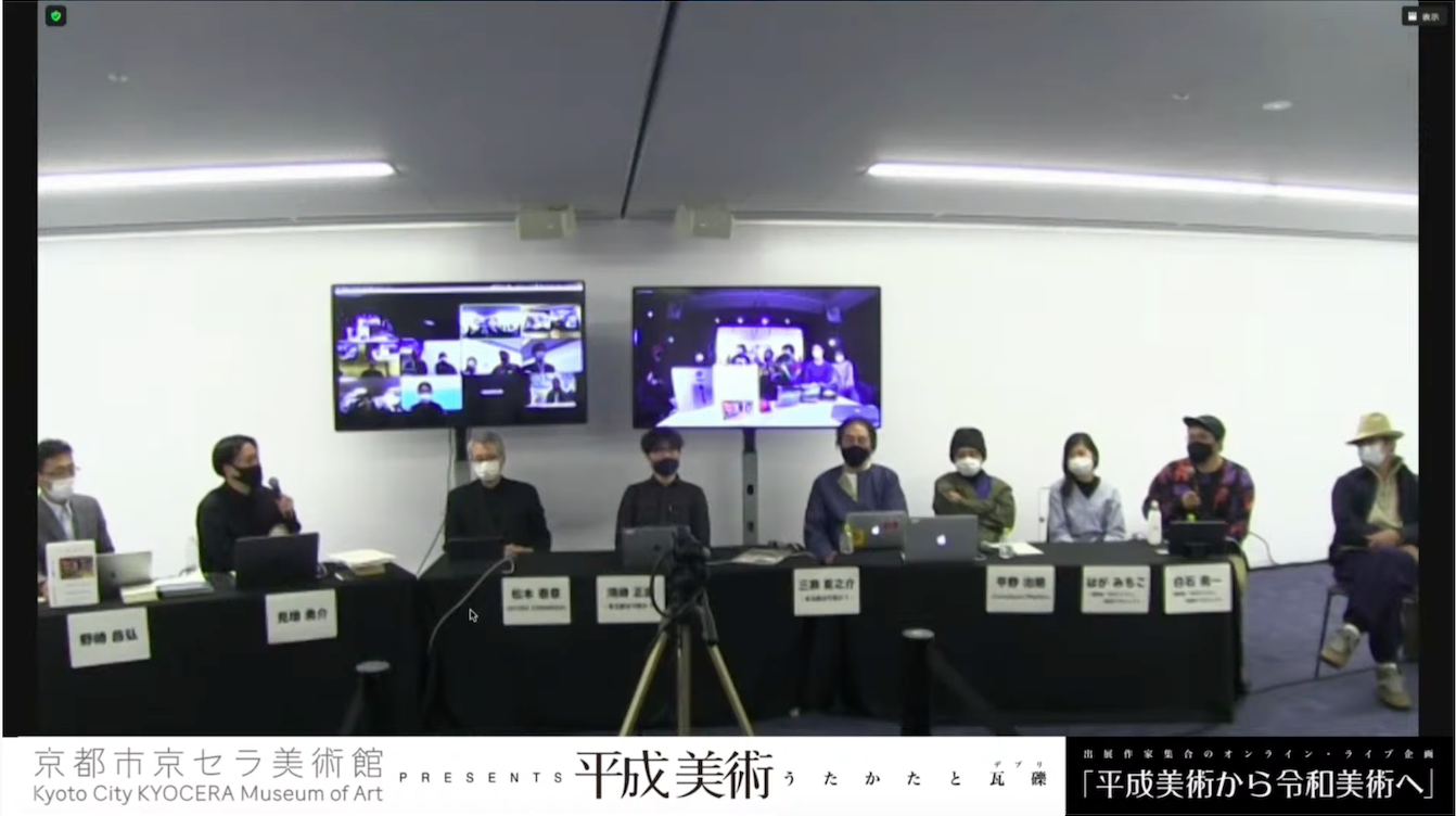 「平成美術:うたかたと瓦礫(デブリ) 1989–2019」の関連プログラムとして、出展作家集合のトークイベントが2021年3月13日オンライン・ライブ配信で実施された(中継会場となった二つの会場では入場制限を行って一般の視聴参加もできるようした)。「平成美術から令和美術へ」と題し、本展の企画・監修者である椹木野衣と出展作家および関係者が、DOMMUNEスタジオ(東京)、京都市京セラ美術館(京都)、一部はオンライン(ZOOM)で参加して各会場に集まり、東京会場と京都会場とをリレー方式で中継。総勢約20名が5部構成、5時間半をかけて議論を繰り広げるという実験的な試みであった。以下は、当企画に進行として関わった見増勇介の視点から、レポートする。